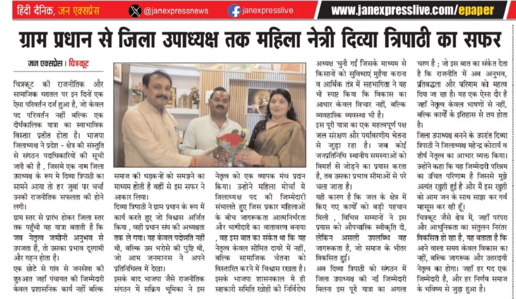 चित्रकूट की राजनीतिक और सामाजिक धरातल पर इन दिनों एक ऐसा परिवर्तन दर्ज हुआ है, जो केवल पद परिवर्तन नहीं बल्कि एक दीर्घकालिक यात्रा का स्वाभाविक विस्तार प्रतीत होता है। भाजपा जिलाध्यक्ष ने प्रदेश – क्षेत्र की संस्तुति से संगठन पदाधिकारियों की सूची जारी की है , जिसमे एक नाम जिला उपाध्यक्ष के रूप मे दिव्या त्रिपाठी का सामने आया तो हर जुबां पर चर्चा उनकी राजनीतिक सफलता की होने लगी।